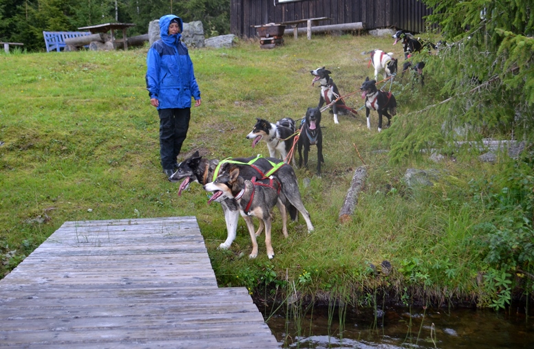 Ved ankomst Måsjøen er det rett til vannet med gjengen – til tross for at det bøtta ned. Karamell og Yifter i tet.