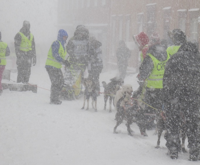 Nå i kveldinga er det nesten ikke folk her på Idrettsheimen. Noen veterinærer, en rennledelse som ordner overnatting, tar telefon etter telefon, gir informasjon, bestiller middag og pizza til folk de har ansvar for. Det er en lavmælt, lett hektisk men ikke egentlig anstrengt stemning. Rennledelsen virker trygge, men konsentrerte. Det er nå klart at 4 av ungdommene er kommet til Narbuvoll mens 4 ennå er ute i uværet. Det diskuteres hvordan frysingen av F-400 skal foregå. Frysingen er forlenget med 4 timer til. Når har vi uttid? spør en kjører som ringer inn. Kan vi bruke nødforet? Kan vi legge bikkjene i bilene? Vi ser på GPS-trackingen at mange av 600-kjørerne samler seg 2 eller flere sammen,og diskusjonen går angående hvor de egentlig er i øyeblikket. Ved skytebanen på Tynset sitter det visst ganske mange, ser det ut til, Sjekkpunkt Tynset er gjeninnført, sier et morsomt hode. En sint far av en voksen kjører ringer inn.
