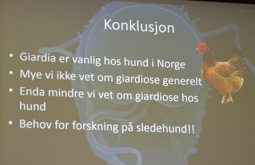 Kristoffer Tysnes, veterinær fra Norges Veterinærhøyskole, holdt et innlegg om Giardia. Jeg innrømmer at dette ikke er mitt hovedkjerneområde hva angår fokus, men jeg har selvsagt full forståelse for at folket vil høre om dette, årets angrep tatt i betraktning. Kristoffer har studert Giardi i sitt doktorgradarbeide og har litt å fare med om temaet. Likevel må jeg innrømme at vi ble ikke så veldig mye klokere etter dagens innlegg. Konklusjonen ble vel at det er mye mer vi (de) ikke vet om Giarida enn det vi vet. Jaja.