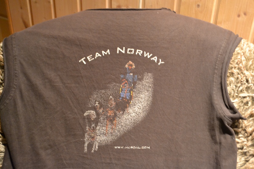 Hva som er så spesielt med den T-skjorta? For det første er den svart. Veldig praktisk. Dessuten ser man ikke fullt så bleik ut i den som i den hvite. Så fant jeg en perfekt størrelse. T-skjorter må være litt store, men ikke gubbetelt. Så er T-skjorta den siste i sitt slag. Det kommer ikke flere Team Norway-trøyer. Robert var ikke altfor ivrig etter å gå rundt med «guttungen» på ryggen, så litt mumling i barten var det.