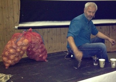 Stein Håvard kom trekkende til Harestua med 2 løksekker; de var tiltenkt premie til to som kunne svare riktig på kontrollspørsmål etter foredraget.