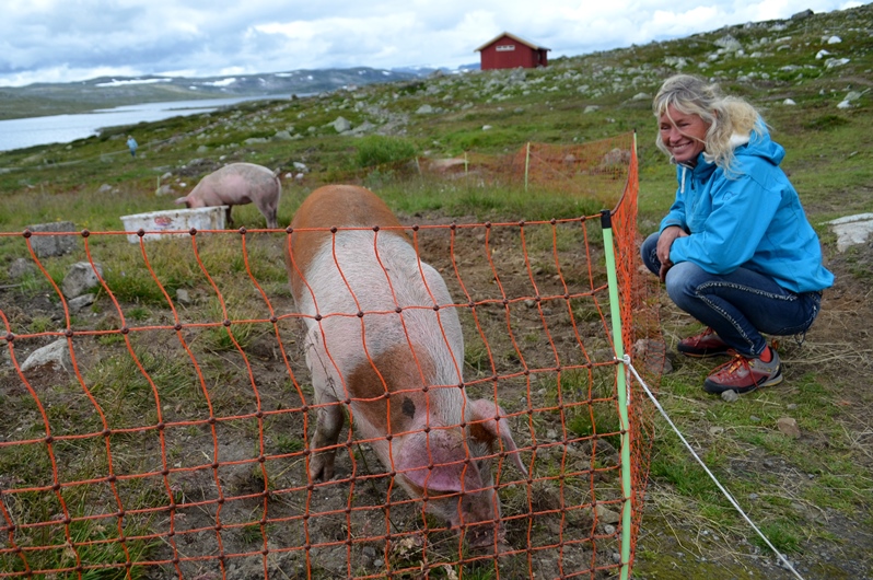 Jeg så ikke rev eller oter, men griser, hester, flotte hunder, en hane og en flokk med høner. En særdeles frittgående variant.
